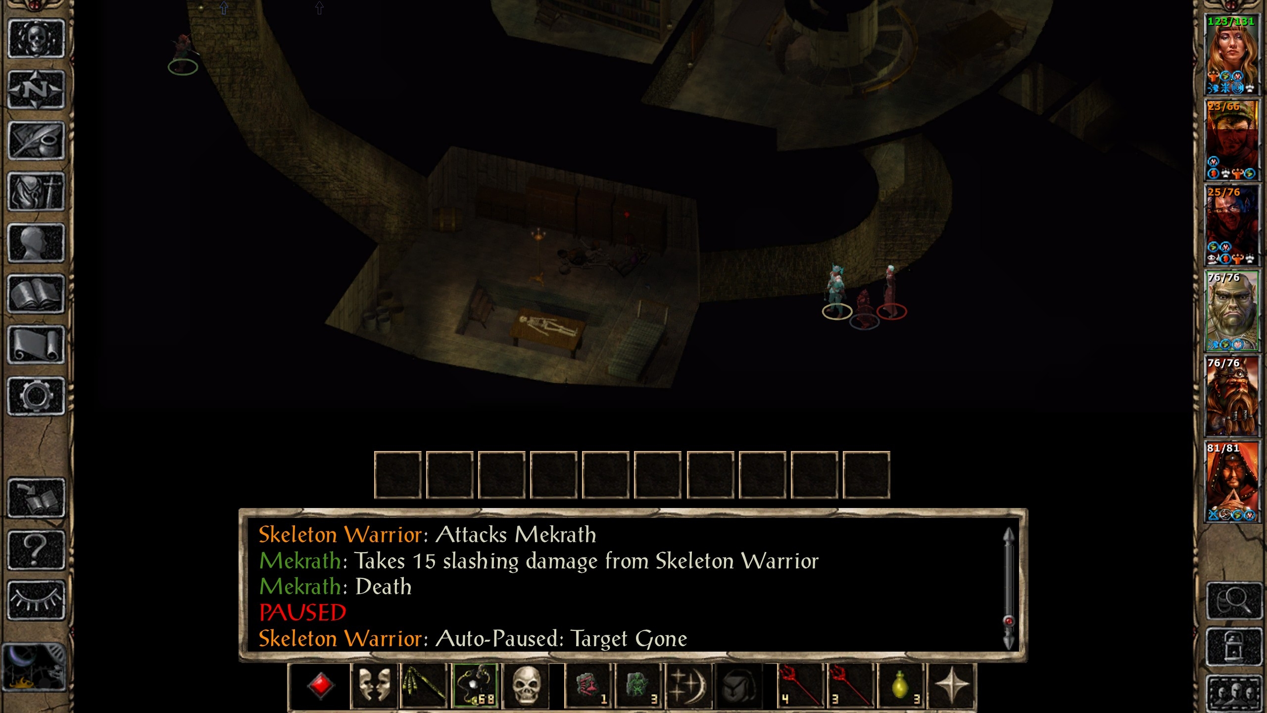 Back in Candlekeep, I had no way to get the tomes, but DUHM provided a small consolation prize with the PfM scroll in a third tomb. I had the opportunity to get past Prat's gang without conflict, but chose to attack them from the rear. I was most concerned about Bor and he did well to resist a number of stunning dart hits after being scared. Once the others were dead Bor was tracked down and scared once again. He resisted a couple more dart hits, but finally succumbed to a melee attack.