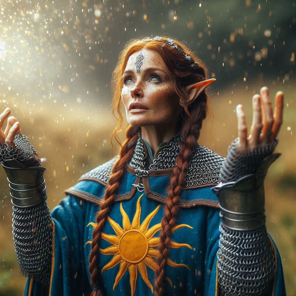 (50 year old half-elf woman, Scottish, long braided red hair streaked with grey, green eyes, freckles, slim, fit, indulgent smile, sleeveless blue tunic with long skirt).
