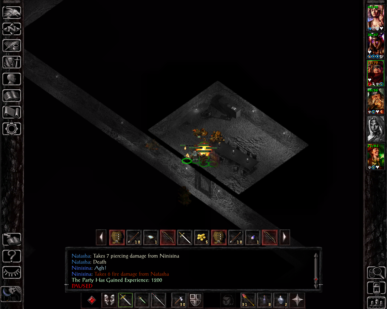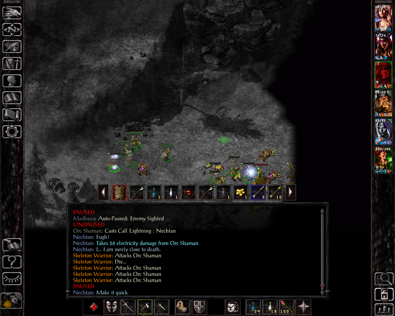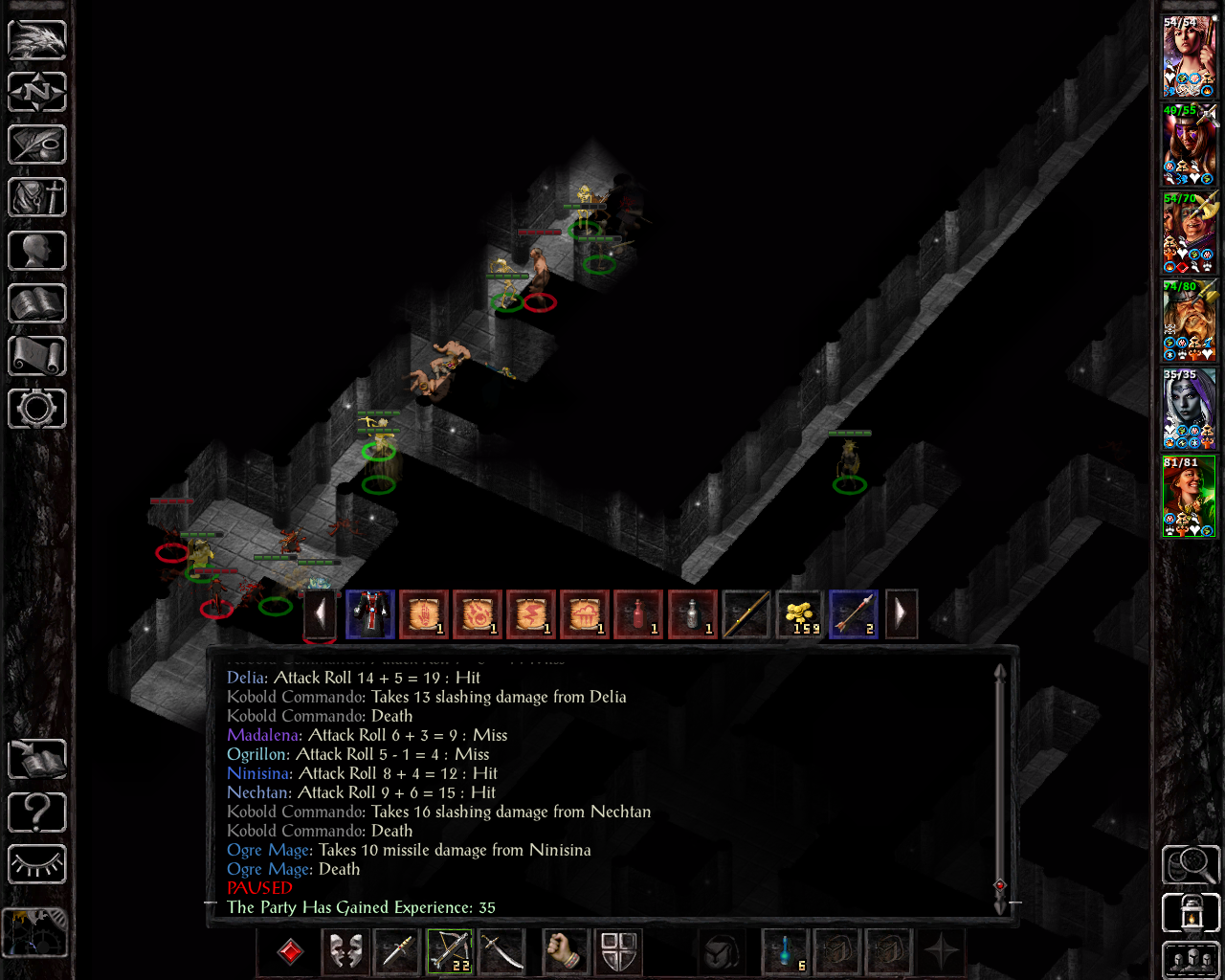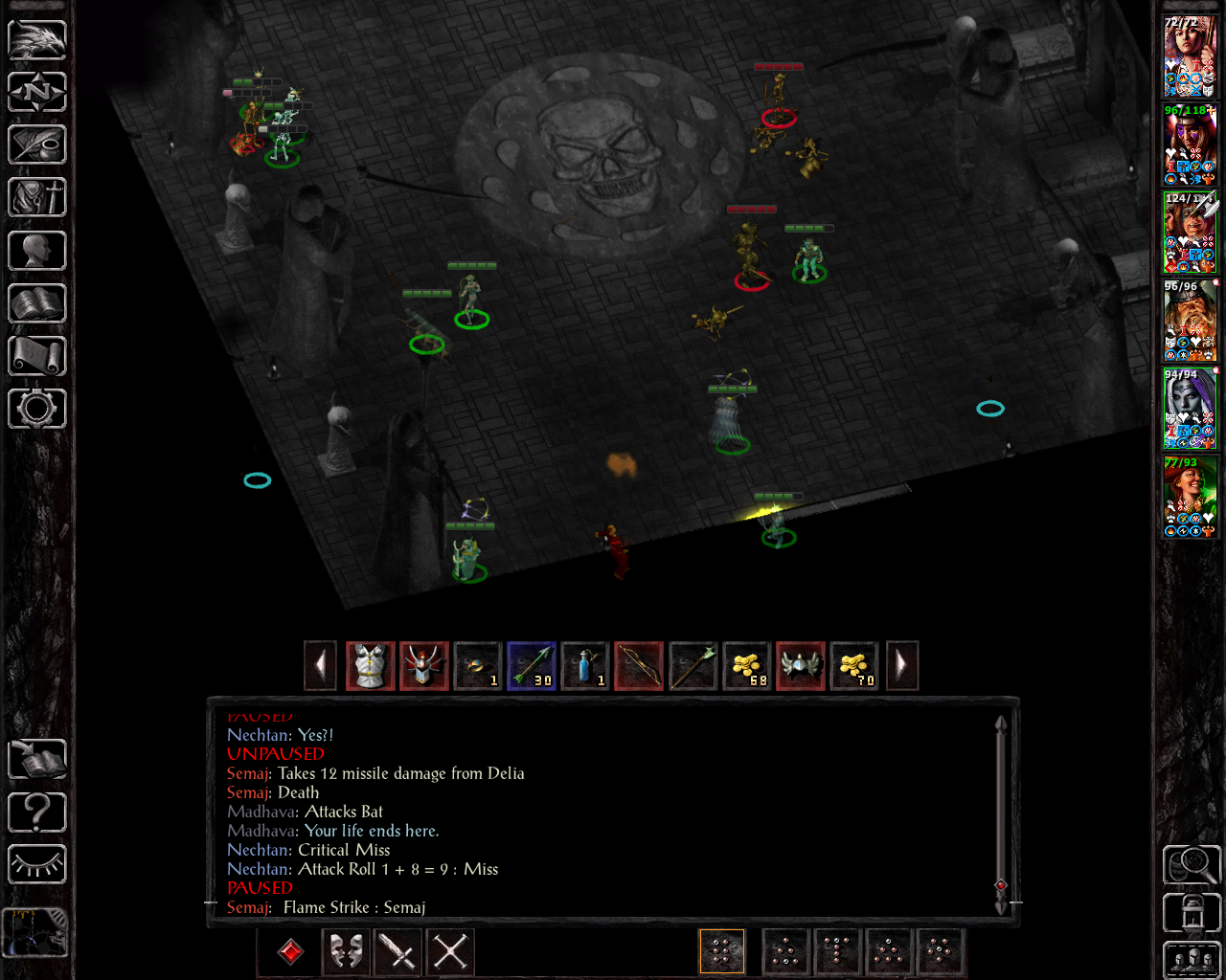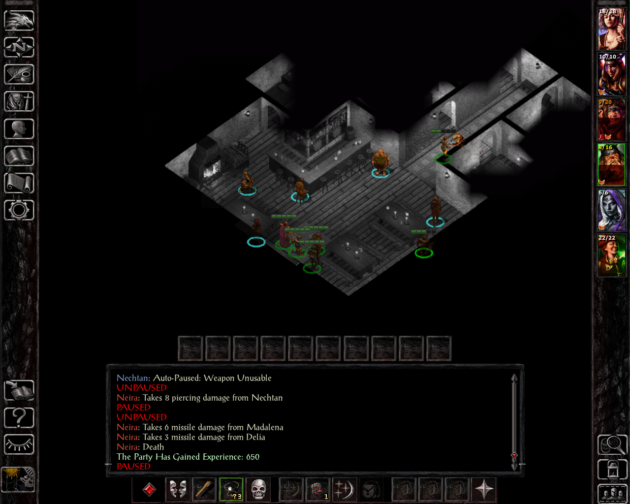 Nechtan is using his two +3 short swords, the others have acceptable ranged options. We go directly after Big B, since the devil groups he calls in on insane are pretty big, so we just want to take him out asap. Madhava has to quickly cast remove fear to save Ninisima - I was using potions of clarity for anti-fear protection and forgot that, as a wizard slayer, she obviously didn't have one of those active as she can't use them: