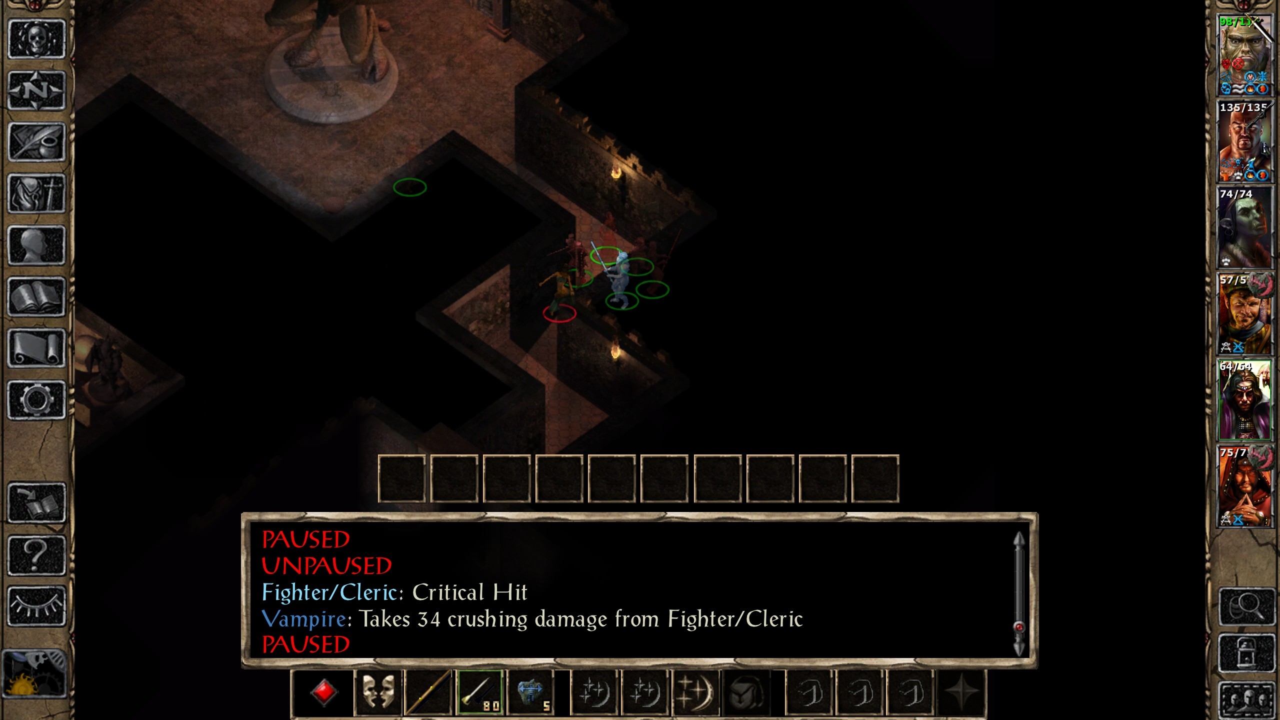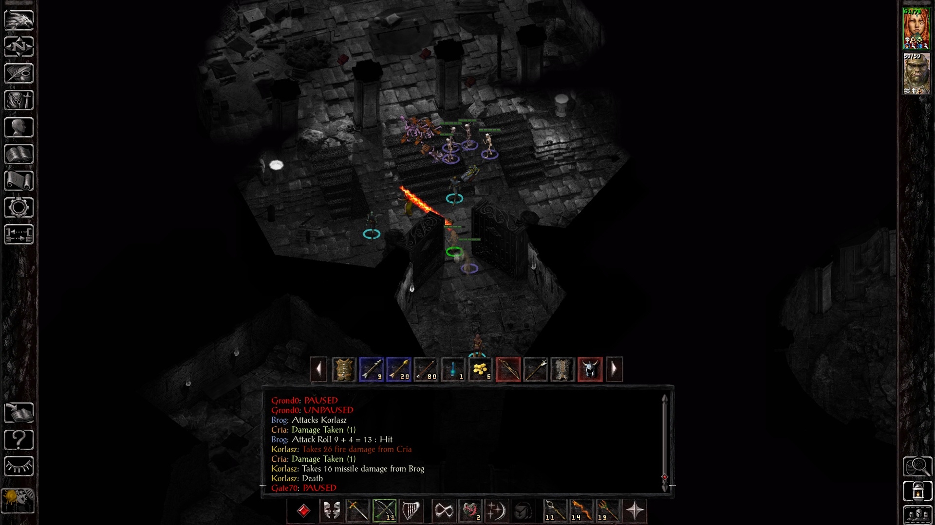 After clearing the level, I decide that maybe we can take on the first group of statues - no arcane spellcasters there, after all, and Foebane would be a nice upgrade for Leda. There are two warriors and two clerics to face here, and I did NOT remember how high level they were (in fact, the warriors are into HLA levels - the first one using war cry (countered by remove fear), the second one later on would use power attack). While I was running back towards the exit, unsure if I could take on two high level clerics, the power attack foe ended up stunning Leda, but her stoneskins held up for long enough to get the kill - as a result of our position, the two clerics moved into a cloud effect that sometimes damaged, but rarely interrupted them - I honestly got quite lucky that their spells never amounted to anything substantial right away - I resisted a full greater command, for example. Still, I had to outlast them while Leda was stunned: