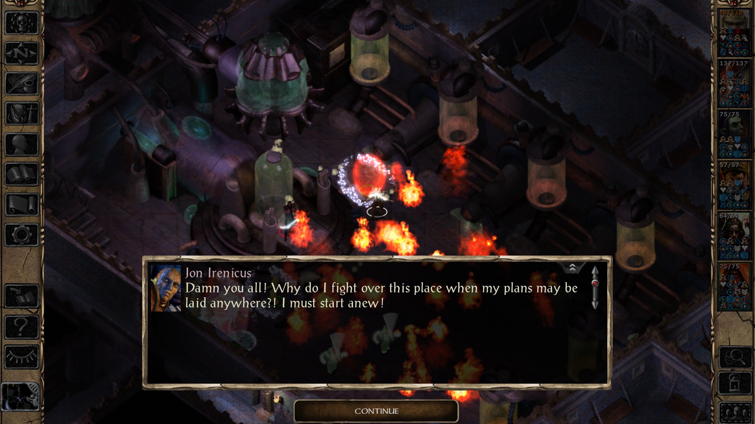 We exit the maze, bribe Lonk, and engage Irenicus. Barbarian is not so happy about spending time in an Incendiary Cloud, but we have sufficient spellworks to strip Irenicus of his defenses, and the ensuing Murderers pose no threat to us. Spellhold, cleared.