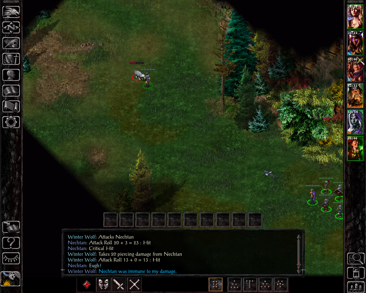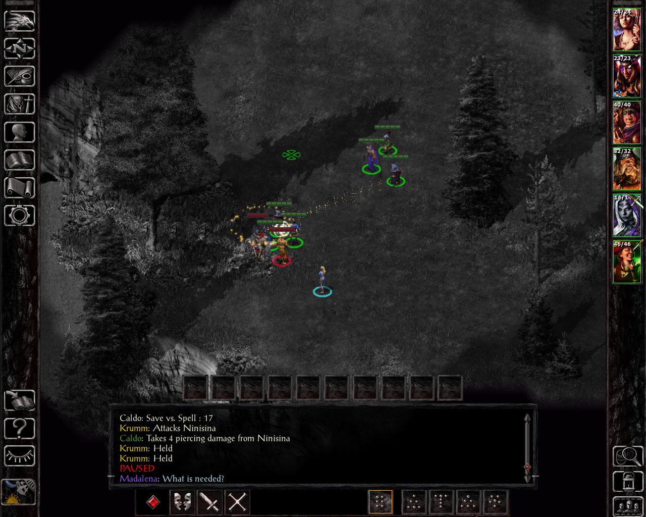 In the Windspear HIlls, where I mainly wanted to drop of the acorns, the cleric during the attack on Garren's home was surprisingly high level. When she was casting an enchantment spell on Madalana, I expected some kind of charm or confusion, separated her from the party and activated chaotic commands as a response - however, SCS has now turned symbol spells into enchantment spells as well to give the school some higher level options, and this turned out to be the unusual symbol: death - luckily, this one can't even affect Madalena with her current hit point count: