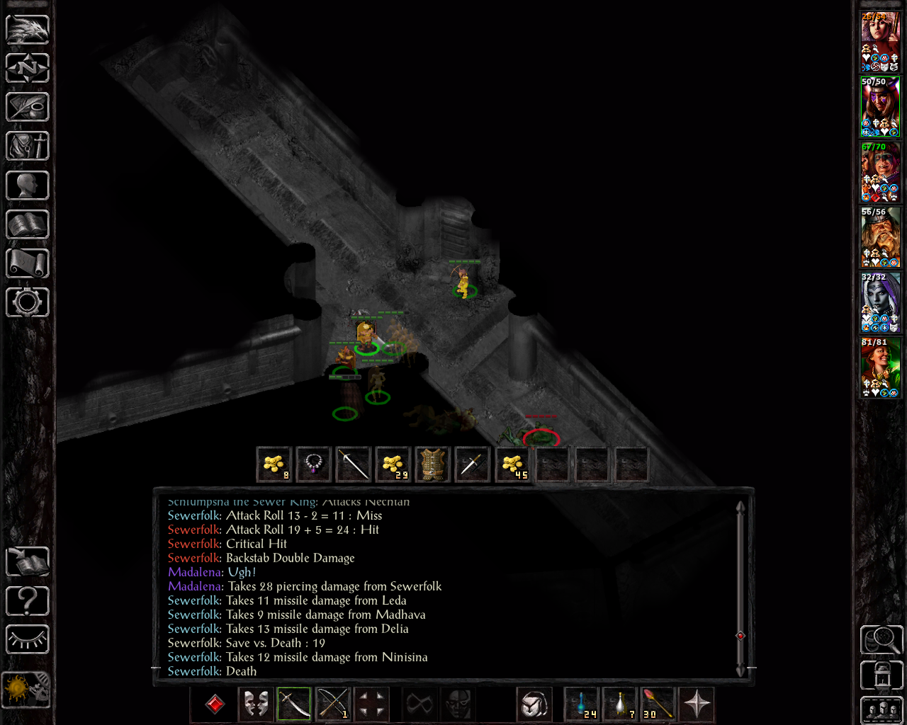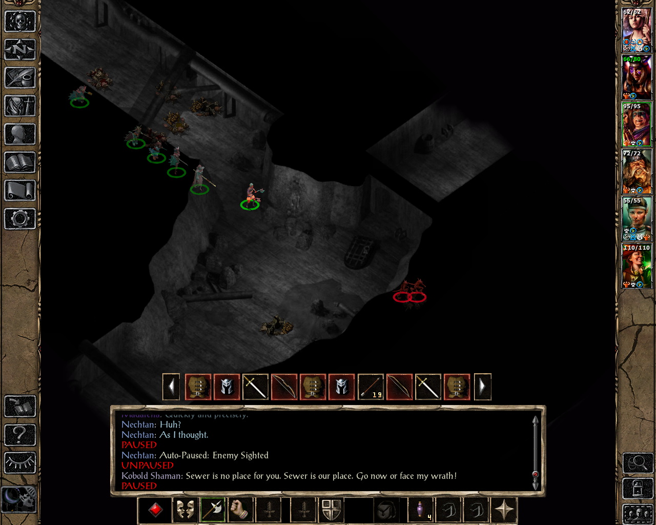 We move south and take down the rakshasa. Luckily, there are still some skeleton warriors left, because they kind of save us when two gauths and a beholder suddenly teleport on top of the party in the south-western sewers. I forgot that insane SCS will activate all of these high-level random encounters. The party gets away just in time: